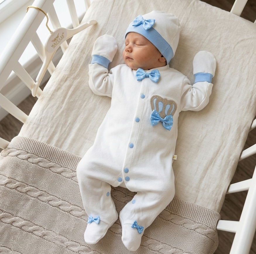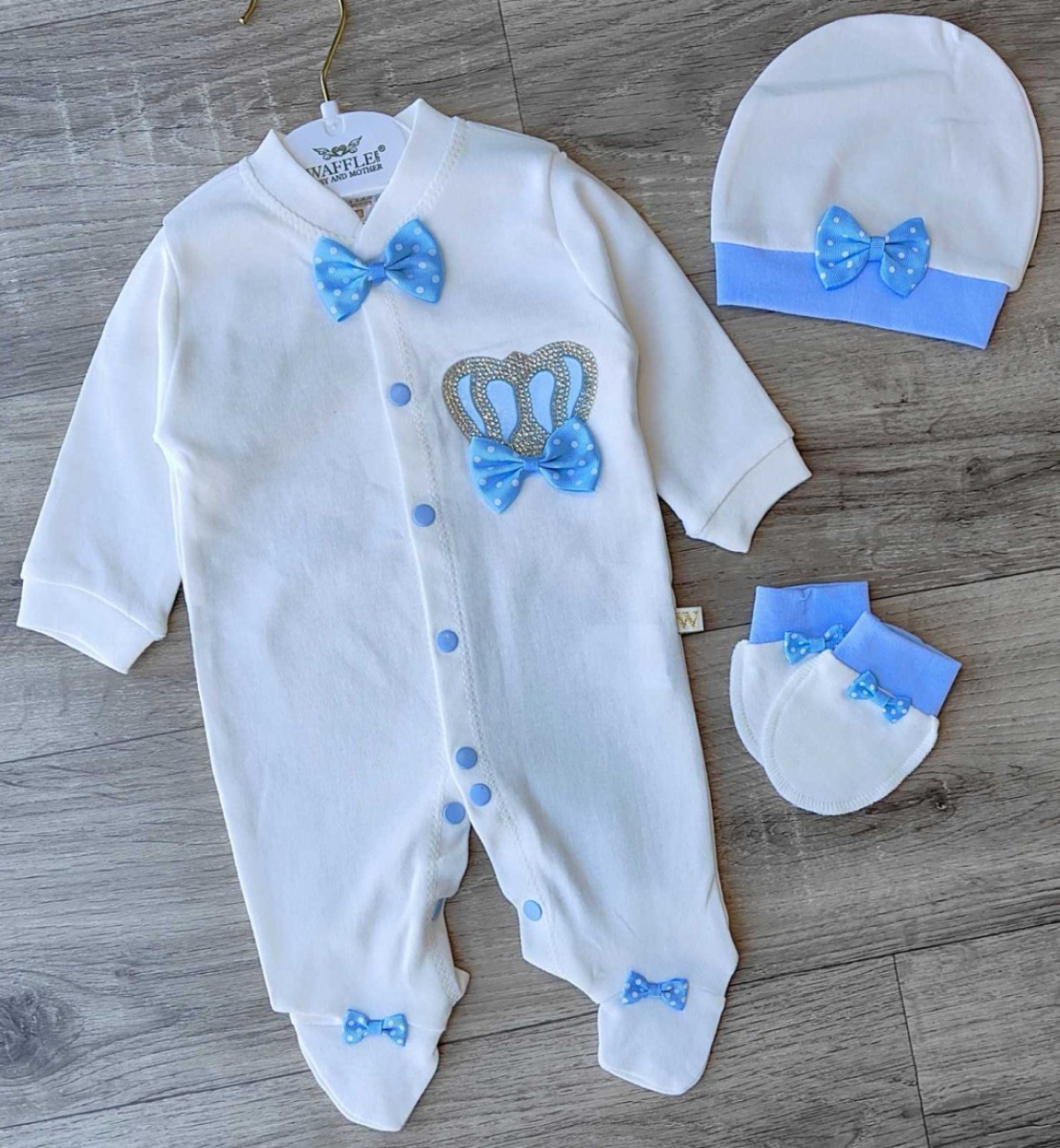 Человечек Waffle "Корона+голубой бант" белый , мальчик 0-3-6 месяцев оптом уп. - 3 шт.